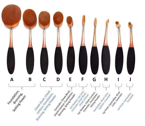 This set comes with 10 brushes. See the pic below for suggested uses for each: